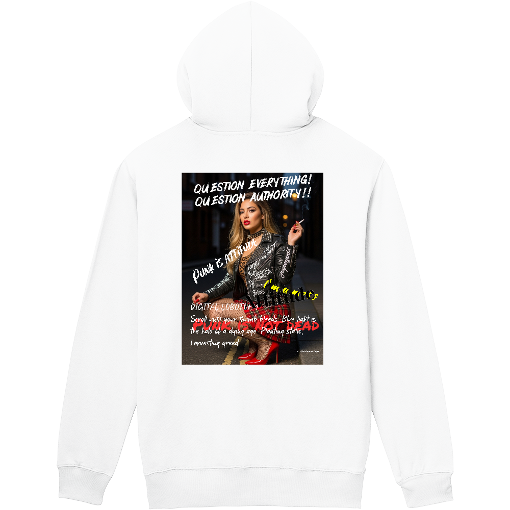 ロンドンの路地裏で一服するパンクガール。 「QUESTION EVERYTHING! QUESTION AUTHORITY!!(すべてを疑え!権力を疑え!!)」 「PUNK IS ATTITUDE(パンクとは姿勢だ)」 「I'm a mess(俺はめちゃくちゃだ)」 「ATTITUDE(基本)」 「DIGITAL LOBOTOMY(デジタル・ロボトミー)」 「PUNK IS NOT DEAD(パンクは死んでいない)」 反権威主義と現代のデジタル社会に対する深く鋭い批判を融合させた作品となります。