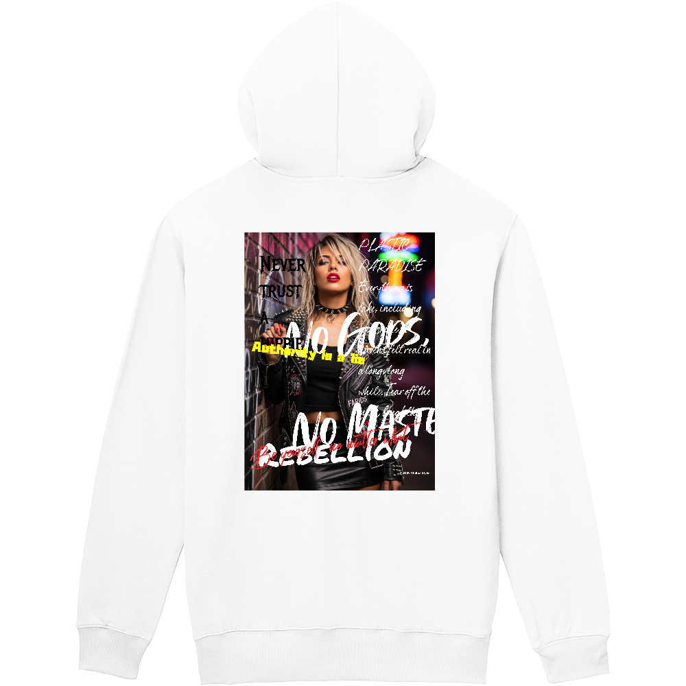 ライブ帰りのパンクガール。 「NEVER TRUST A HIPPIE(ヒッピーを信じるな)」 「PLASTIC PARADISE(プラスチックの楽園)」 「No gods, no masters(神も主もいらない)」 「Authority is a lie(権威は嘘だ)」 「REBELLION(反抗・反乱)」 「Be yourself, no matter what(何があろうと自分らしくあれ)」 現代社会の虚飾と疎外感を訴えかけ秩序への反抗と、個人の内なる声を叫んだ作品となります。